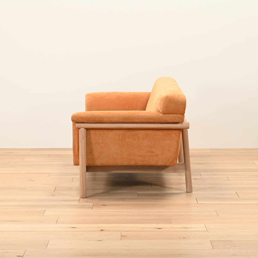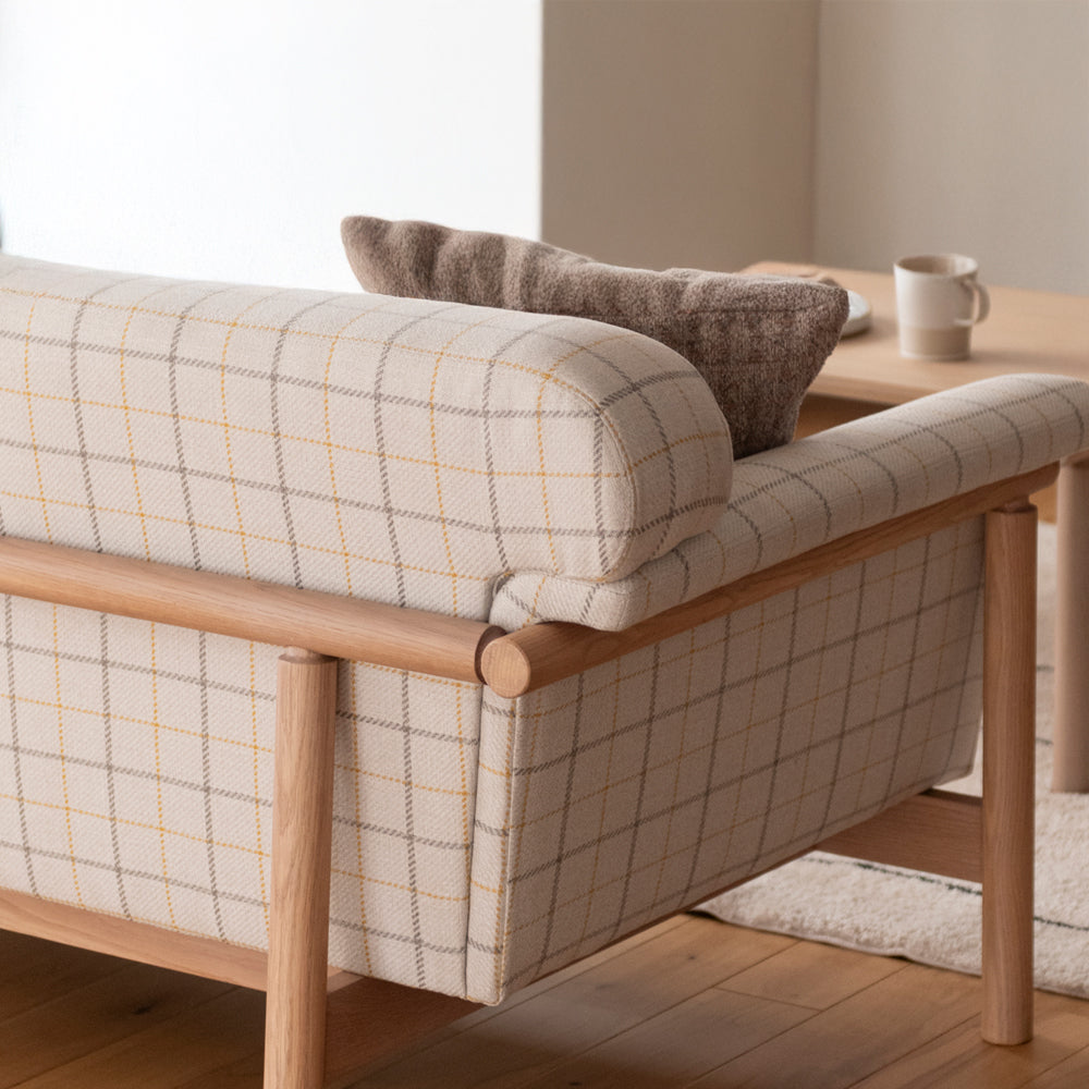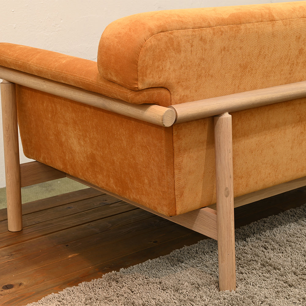 肘から背にかけて使われたオーク無垢材は、美しさと優しさを